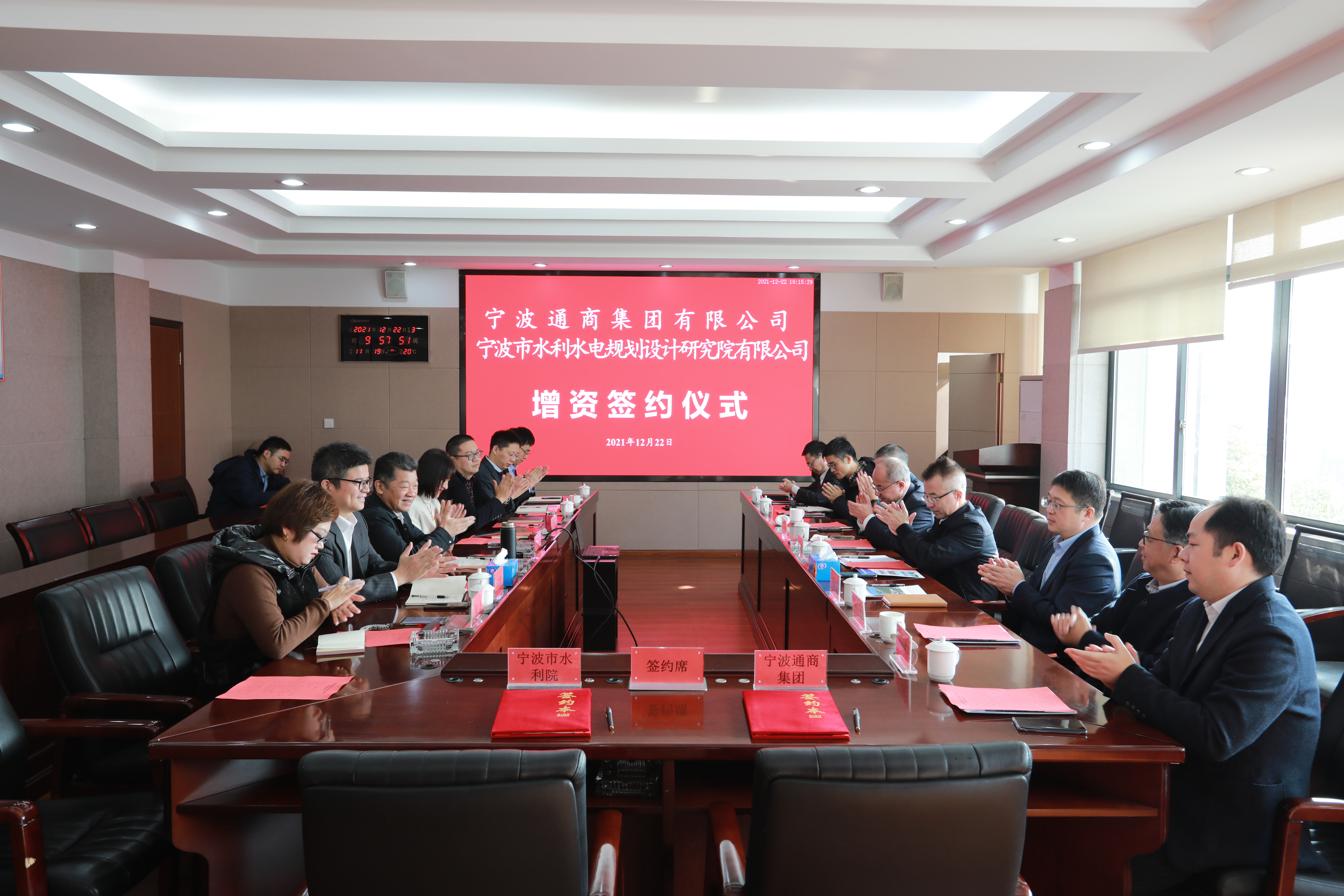 为积极响应我市国资国企发展新要求,引领数字产业和现代服务业发展,12月22日上午,通商集团与宁波市水利水电规划设计研究院有限公司(以下简称“宁波水利院”)举行战略投资签约仪式,通商集团以增资方式战略入股宁波水利院,通过国资赋能,共同打造宁波智慧水利新名片。宁波市国资委党委副书记、副主任沈恩东,宁波市水利局党组副书记、副局长史俊伟,宁波通商集团党委书记、董事长宋达军,党委副书记、副董事长、总经理张旦等出席仪式。